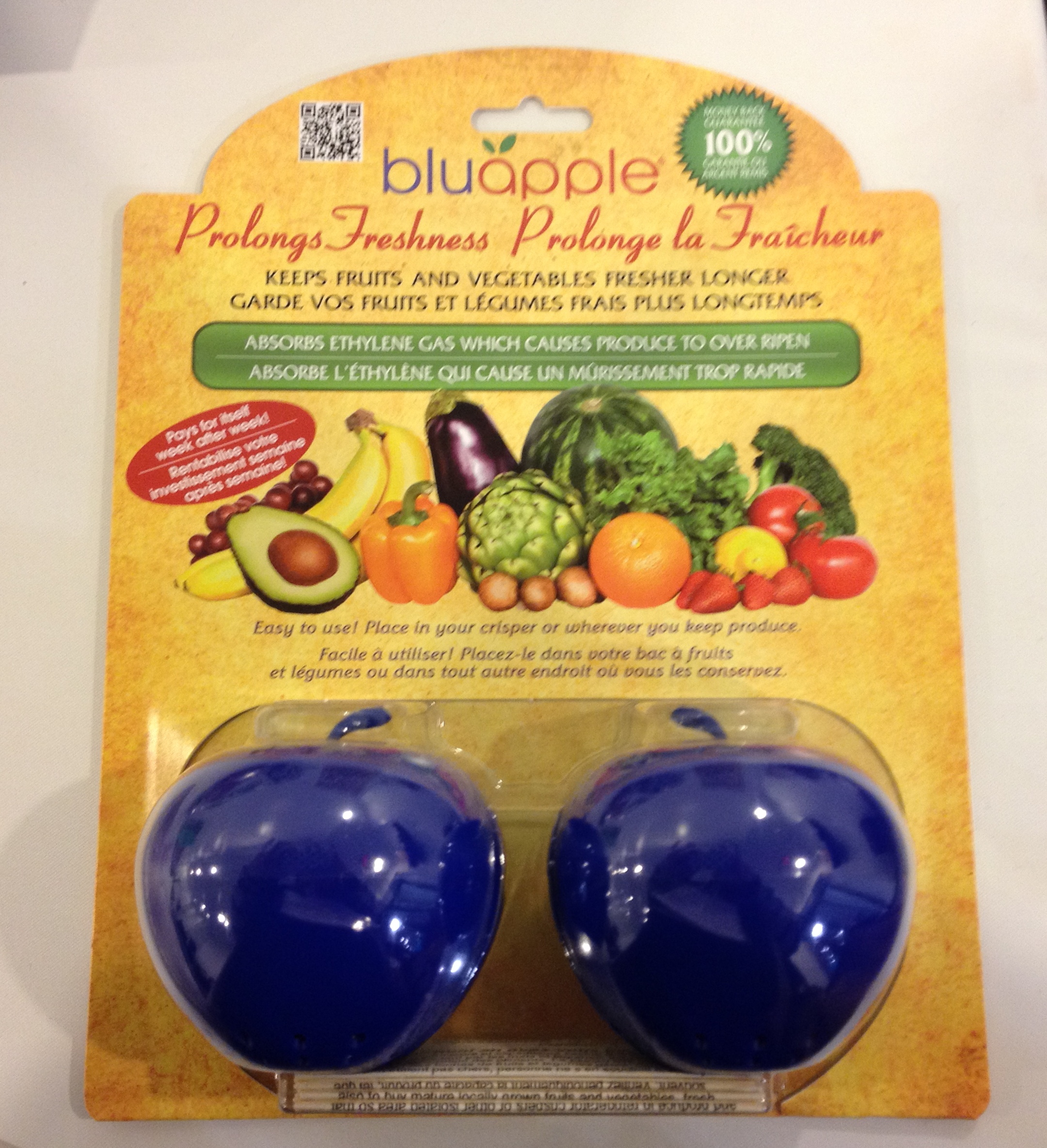 And speaking of your compost bin, are you tired of pitching produce that has gone bad in your refrigerator? Then you might want to purchase the Blue Apple. It’s designed to absorb the ethylene gas in your fridge for three months. Ethylene gas is given off naturally by fruits and vegetables as they ripen. However, once concentrated in your refrigerator or other storage areas, the presence of ethylene gas continues to speed up ripening and hasten spoilage. You can also purchase refills.