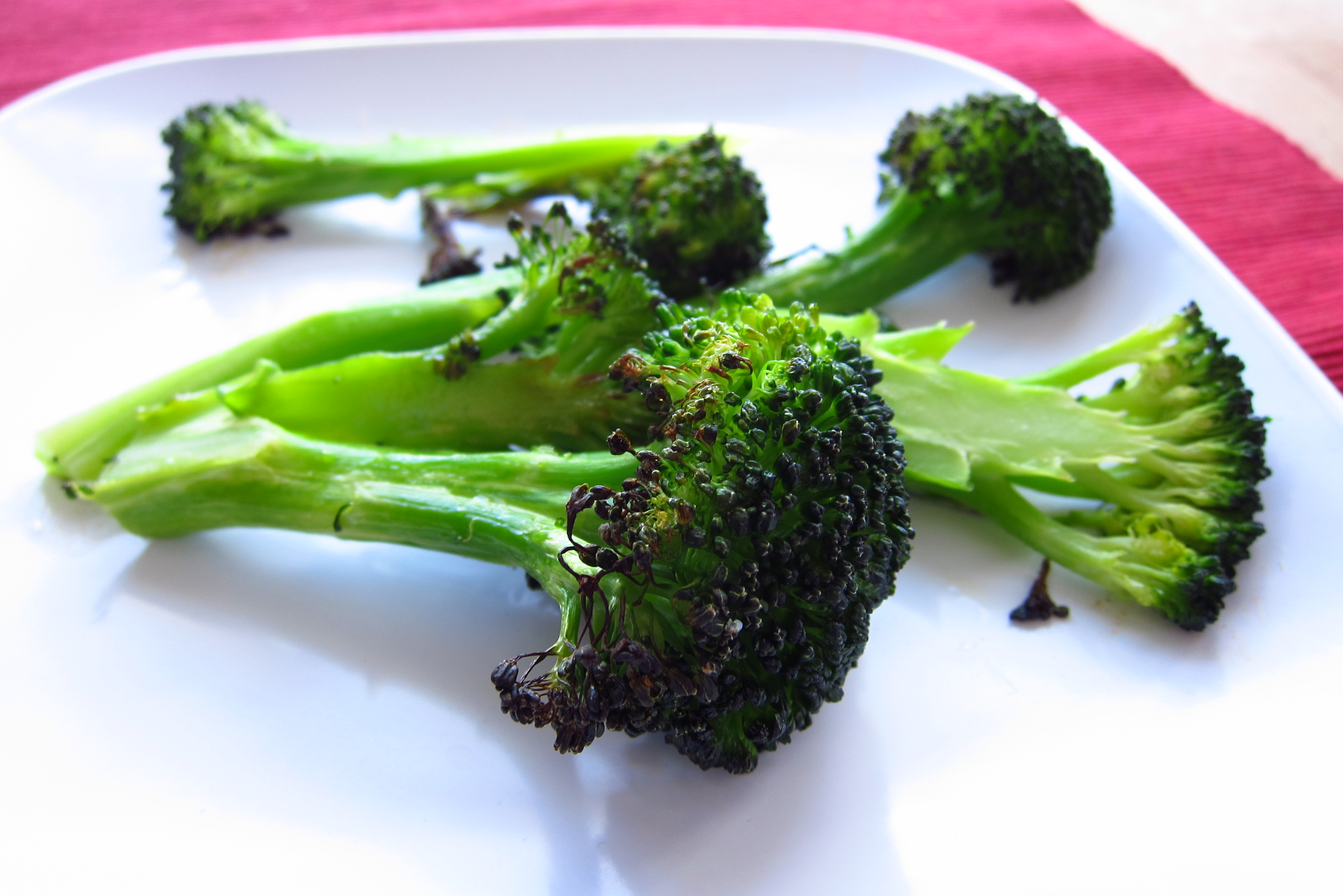 When oven is hot, transfer the broccoli to the baking sheet and roast until slightly browned and very crunchy, about 15 minutes.