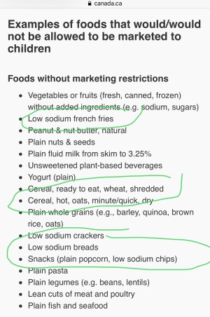 Then there’s the list, “Foods subject to marketing restrictions” which includes “most breads, white and whole wheat”. Most breads? Yes, most breads are not low in sodium. And yes, whole wheat in Canada is not a whole grain (I won’t get started on that nonsense but you can read about my thoughts on that ridiculousness here).