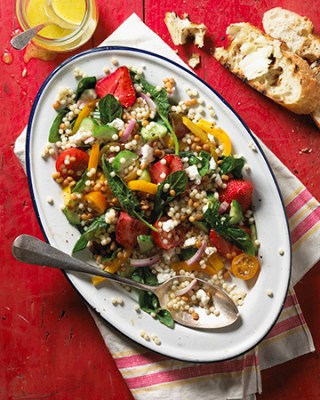 In large bowl, combine couscous, lentils, cucumbers, tomatoes, yellow pepper, onion and basil. Add dressing, stirring to combine. Add spinach, strawberries and cheese; toss.