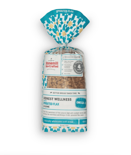 Here is an example of a product that I thought contained only whole grains. The bread is from Stone Mill Bakehouse, a local operation in Toronto. Their Sprouted Flax Bread is part of the company’s Honest Wellness line. Now it’s true that their breads are slow-crafted but with a line that speaks to wellness, I expected whole grain, especially in a sprouted grain bread.