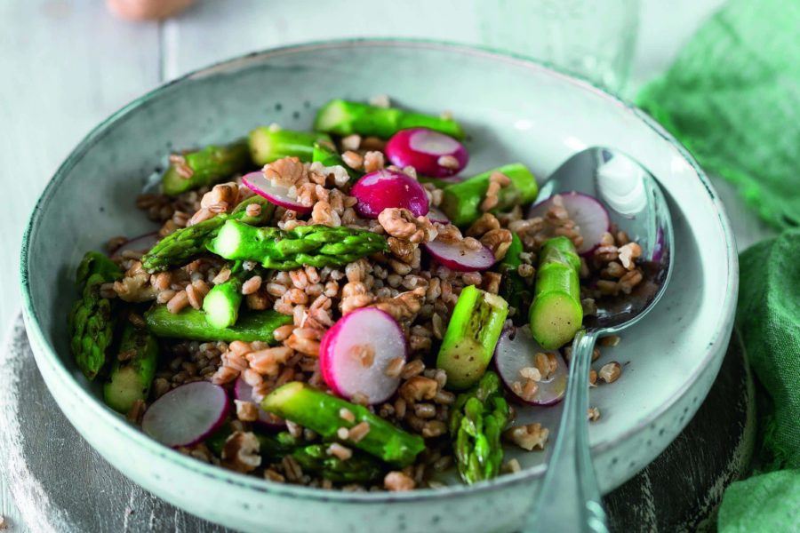 Spelt Salad with Roasted Green Asparagus, Radish and Walnuts