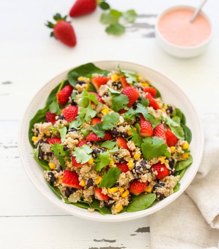 Fold in strawberries and cilantro. Serve cold over a bed of baby spinach leaves and drizzle strawberry dressing over plated quinoa salad.
