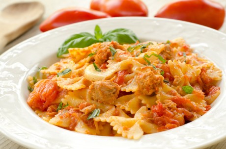While the pasta is boiling, sauté the onion and garlic in the olive oil in a large skillet on medium heat until onion is soft and transparent, about 5-7 minutes.  Add the wine, tomatoes and tuna to the onion and garlic and simmer on medium to medium low heat for about 7 minutes, stirring frequently.