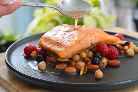 This amazing-looking dish from Canola Eat Well and chef Ned Bell has it all. Just check out the ingredients – fish, pulses, fruit and nuts. On top of that, it’s simple enough to prepare for a weeknight dinner or for brunch or for entertaining – yes, that day will come again. While the recipe provides the fish portion along with pulses, fruit and nuts for two people, if you are preparing for more, increase those quantities accordingly but keep to the same amount of dressing as in the recipe as there’s plenty for more servings.