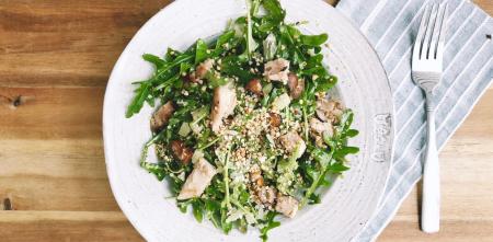 Arugula Salad with Chicken, Dates, and Buckwheat Crumble