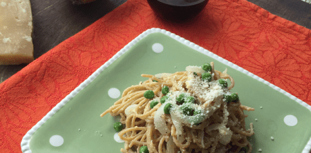 While the pasta is cooking, combine the eggs and cheese in a small bowl, beat, and set aside. Put peas in a strainer, rinse under hot water, and set aside.