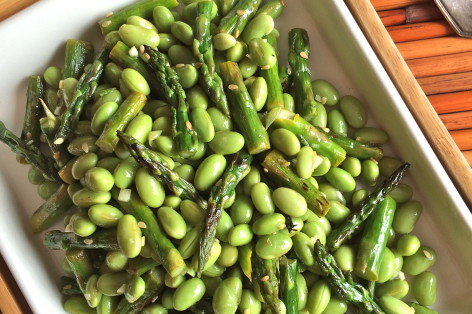 Meanwhile, in a pot of boiling salted water, cook edamame for 5 minutes. Drain well and place in a large bowl; add asparagus.