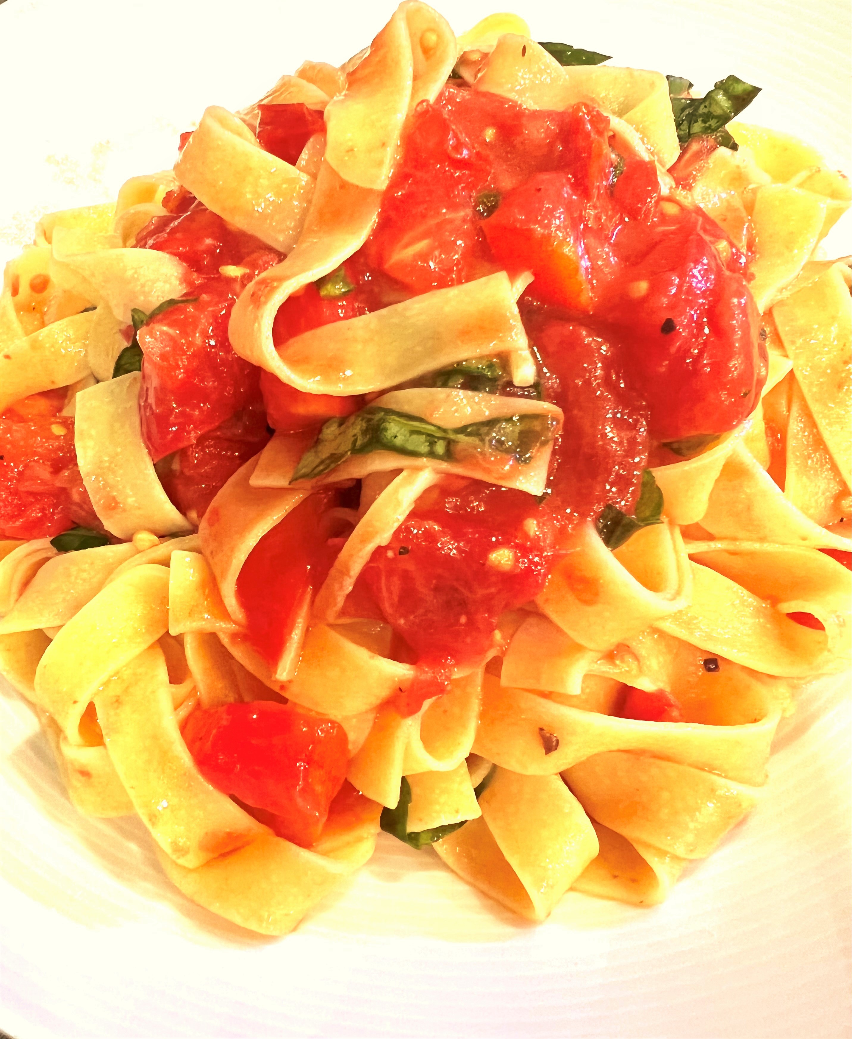 To me, this raw tomato-basil pasta dish is one of my favourite summer dishes – maybe the absolute favourite. It’s one that I have been making for decades.