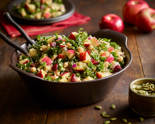 Add kale and toss to coat thoroughly. Stir in chick peas, apples, quinoa and onion.