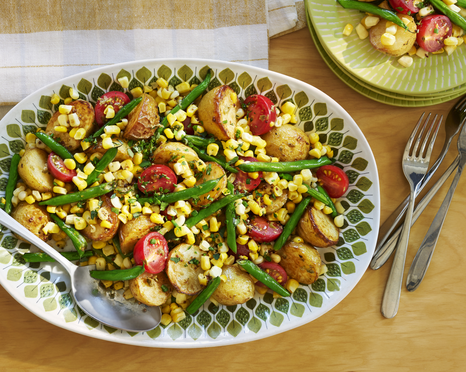 Cut potatoes in half or thirds so they are equal in size. Place on rimmed baking sheet; drizzle with oil and sprinkle with salt. Stir until potatoes are coated. Roast in 425°F (220°C) oven for 15 minutes. Stir in beans; roast 5 minutes. Stir in corn and capers; continue to roast about 5 minutes or until potatoes are tender. Remove from oven; stir in cherry tomatoes. Set aside.